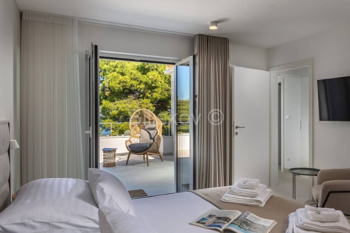 Na katu se nalazi predsoblje te tri spavaće sobe sa kupaonicama te dvije terase.