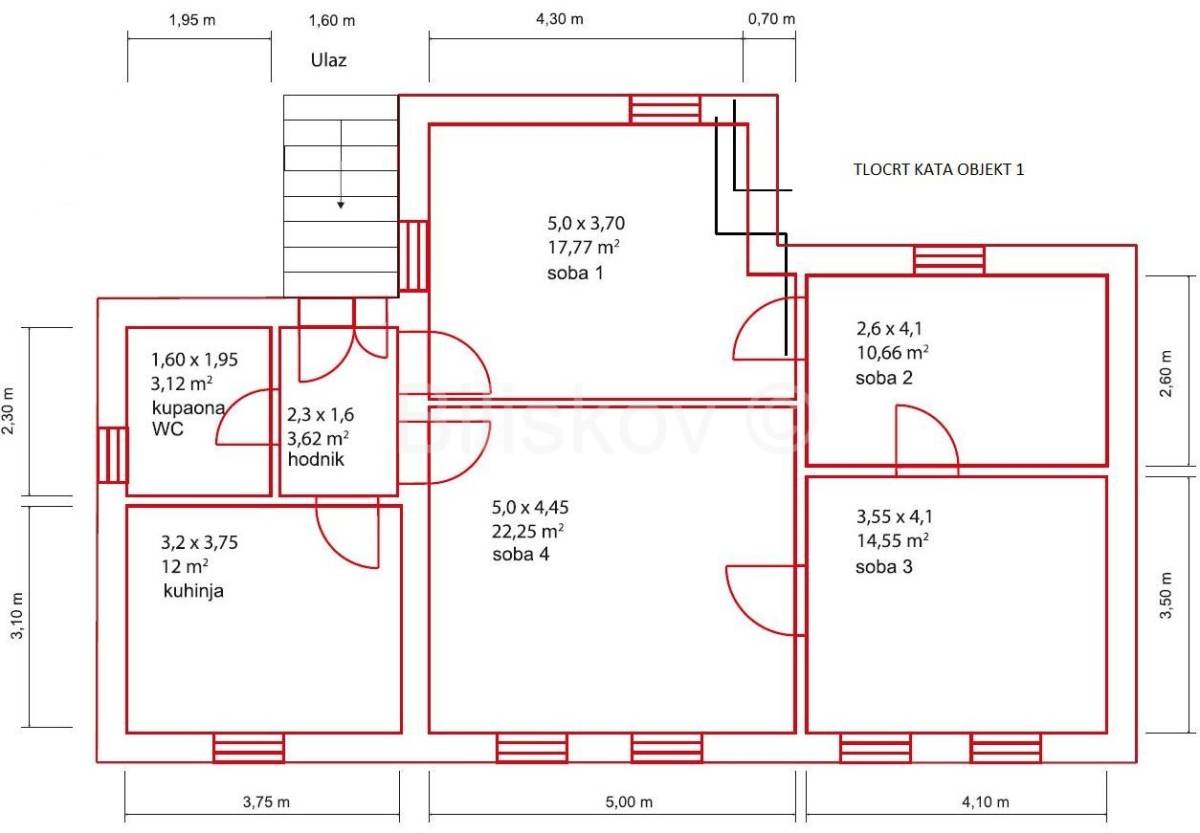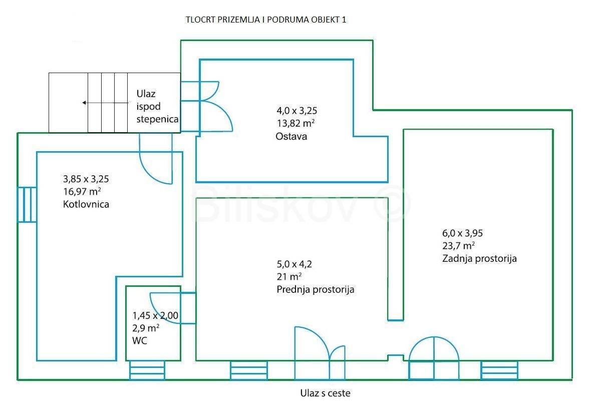 Prvi objekt je kuća s prizemljem i katom. Sastoji se od hodnika, četiri sobe odnosno kancelarije, kuhinje i toaleta na katu, te ostave, kotlovnice, WC-a i dvije prostorije u prizemlju. Prizemlje ima dva ulaza te je trenutačno podijeljeno u dva dijela, ali se manjim zahvatom može pretvoriti u jednu cjelinu.