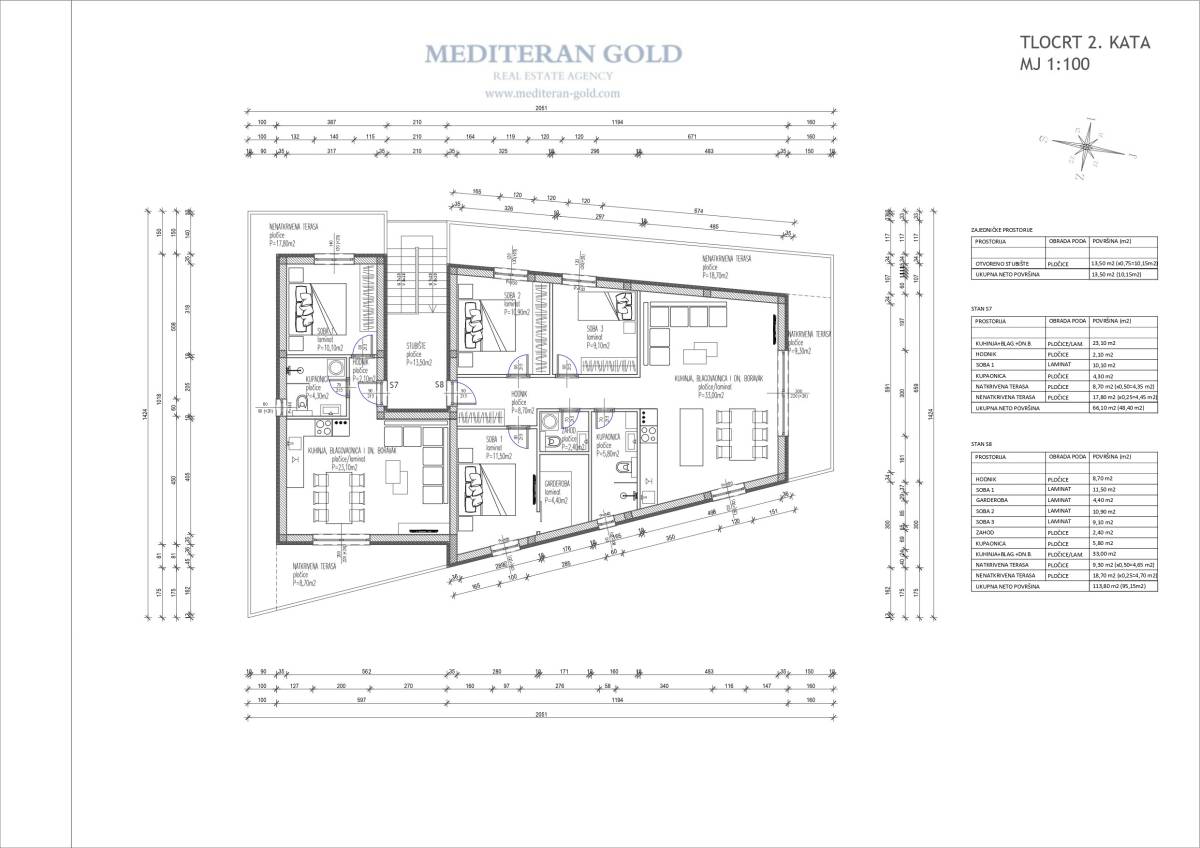 Iz ponude izdvajamo: jednosoban stan (S7) od 66,10m2 položen na drugom katu, velika terasa, cijena je 3.500€/m2 = 231.350€, orijentacije: zapad-sjever.