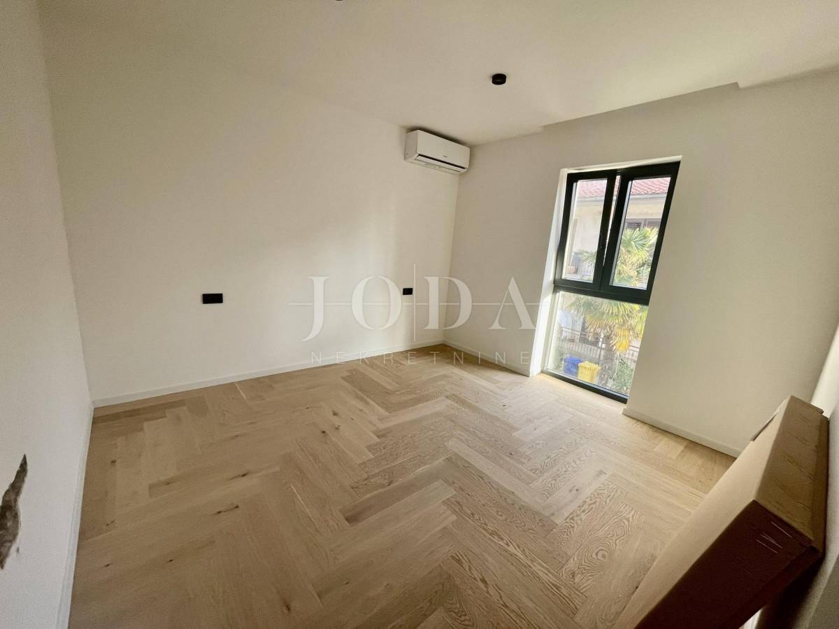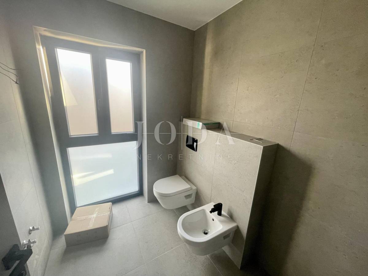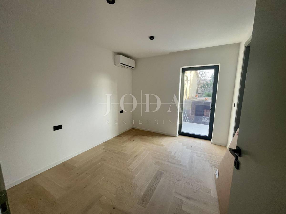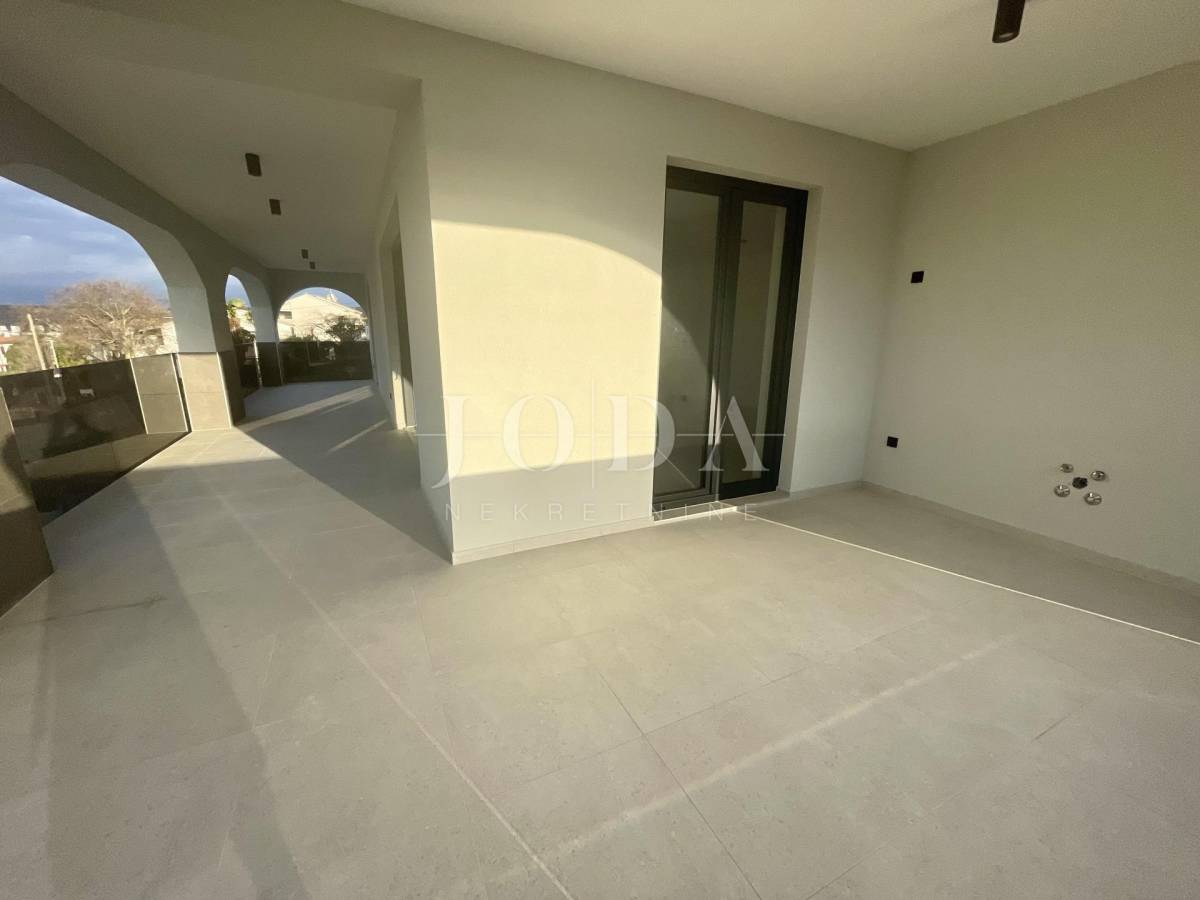 Stan se nalazi na prvom katu stambene zgrade, a sastoji se od hodnika, WC-a, tri spavaće sobe s vlastitim kupaonicama, dnevnog boravka s kuhinjom i blagovaonicom, vešeraja, ljetne kuhinje, balkona i prostrane natkrivene terase površine 29,27 m2 s koje se pruža prekrasan pogled na more. Ugrađeno je podno grijanje u cijelom stanu. U sobama je postavljen prvoklasni parket, a kupaonicama prvoklasne keramičke pločice i sanitarije. Ugrađena je aluminijska stolarija. Prodaje se bez namještaja, ali postoji mogućnost da se po dogovoru nekretnina namjesti. Ima dva parkirna mjesta. Na okućnici se nalazi bazen koji je na korištenje svim stanarima.