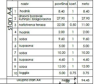 Stan A4, površine 94,45 m2, nalazi se na 2 katu zgrade te sastoji se od: