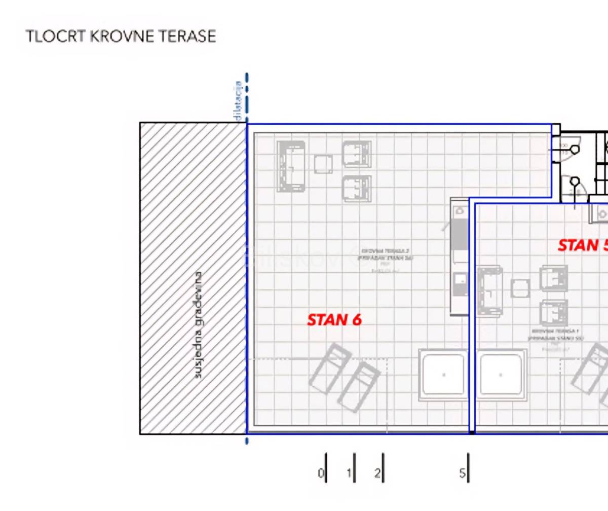 Posebna prednost stana je velika krovna terasa, idealna za opuštanje, druženje ili uživanje u pogledu.