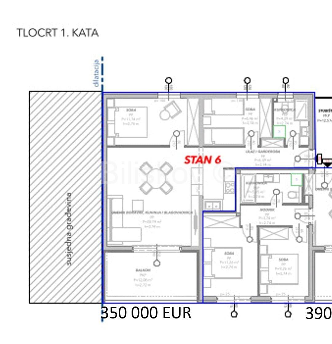Zgrada je kvalitetno građena i prostire se na četiri etaže: suteren, prizemlje, prvi kat i podrum. Na svakoj etaži nalaze se po dva stana, što osigurava mir i privatnost.