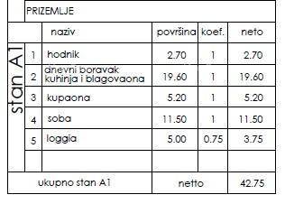 Stan A1, površine 42,75 m2, nalazi se u prizemlju zgrade te sastoji se od: