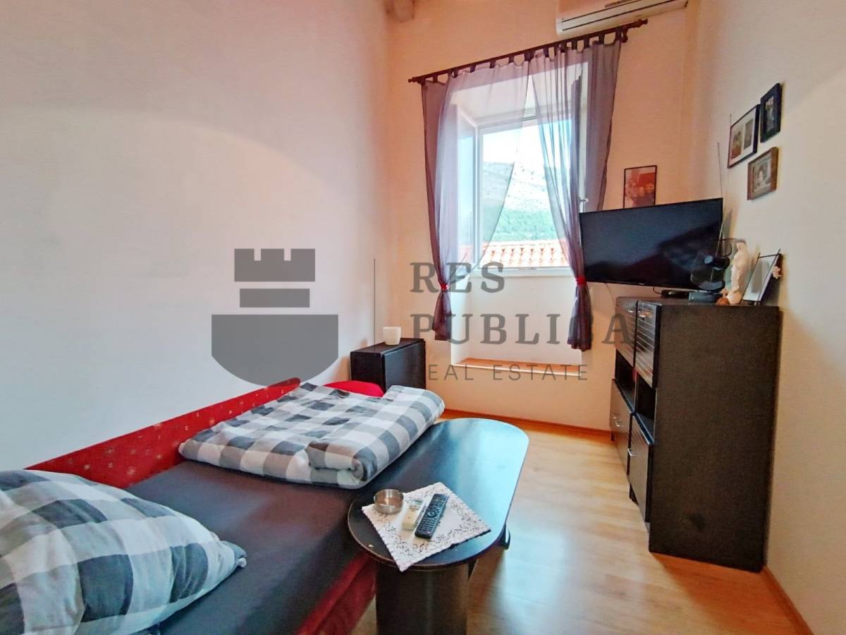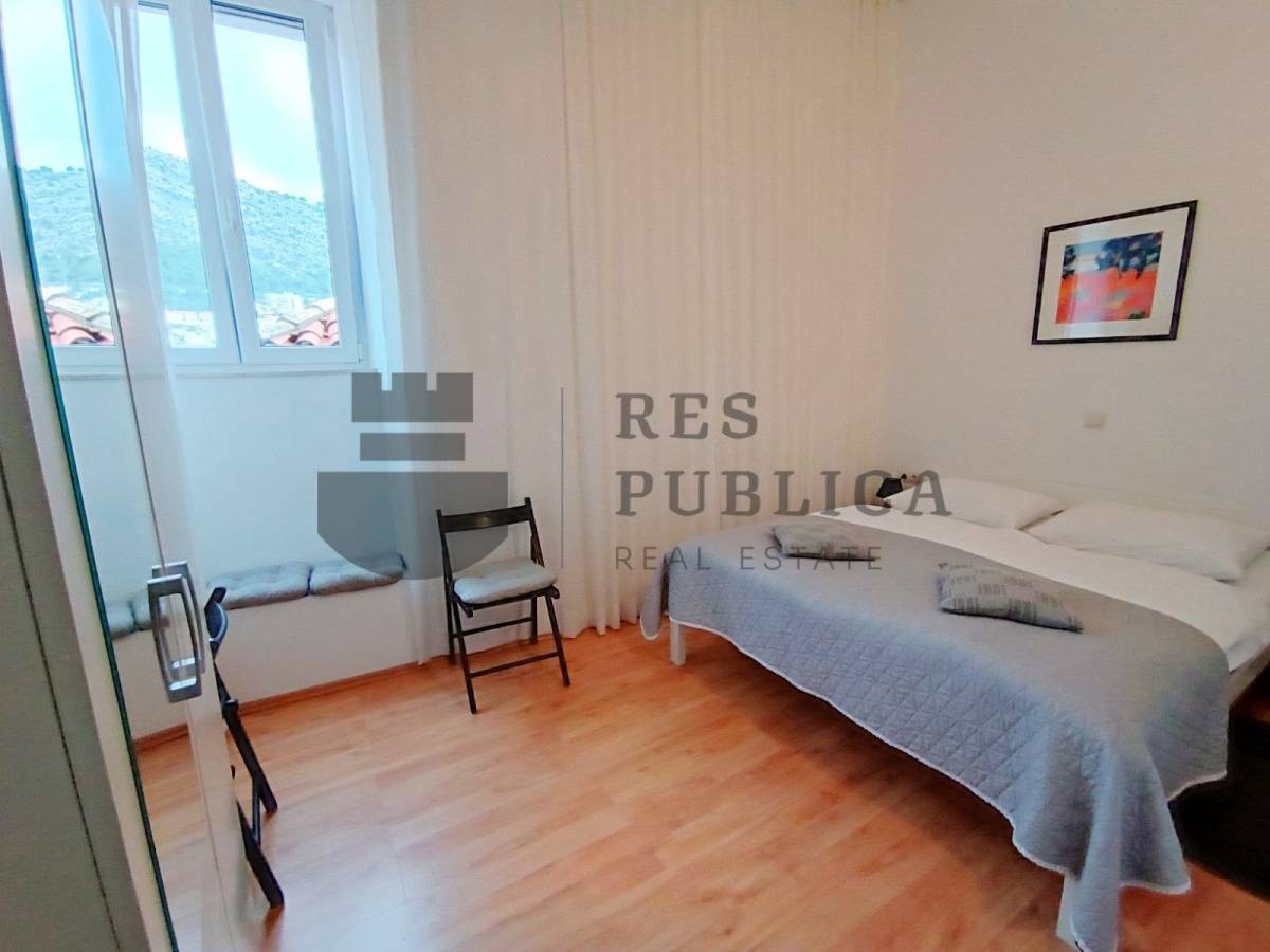 Pogled se pruža preko krovova obližnjih kuća i hvata cijelu planinu Srđ i dio Ploča.