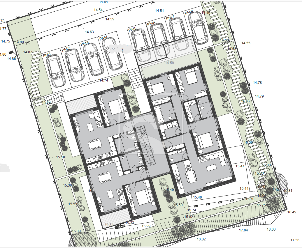 Zgrada se sastoji od 8 stambenih jedinica od kojih su 4 u prizemlju te 4 na 1. katu. Ista je projektirana od strane poznatih arhitekata što se vidi po samim vizualizacijama iste.