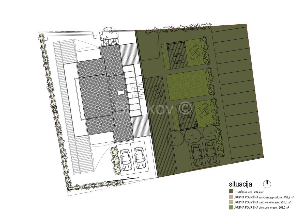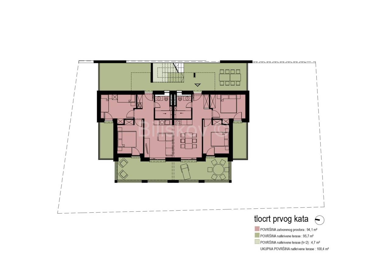1.KAT – 4-sobni stan koji se sastoji od kuhinje, blagovaonice, dnevnog boravka, 4 spavaće sobe, 2 kupaonice i terase