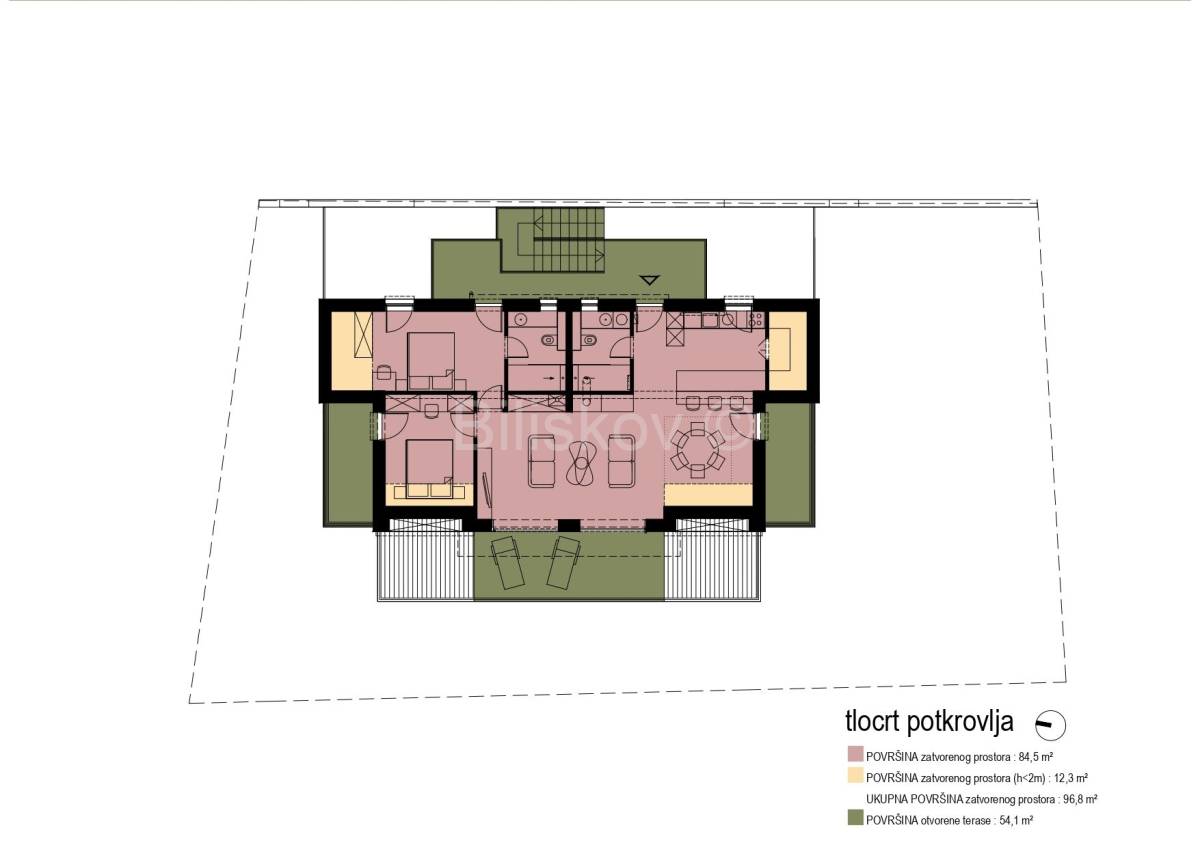V.POTKROVLJE – dvosobni stan koji se sastoji od kuhinje, blagovaonice, dnevnog boravka, 2 spavaće sobe, 2 kupaonice i terase