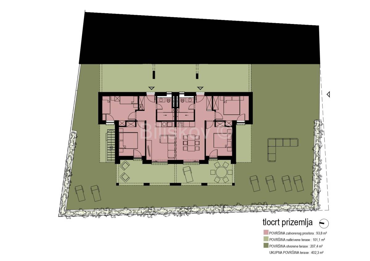 PRIZEMLJE – 4-sobni stan koji se sastoji od kuhinje, blagovaonice, dnevnog boravka, 4 spavaće sobe, 2 kupaonice i terase
