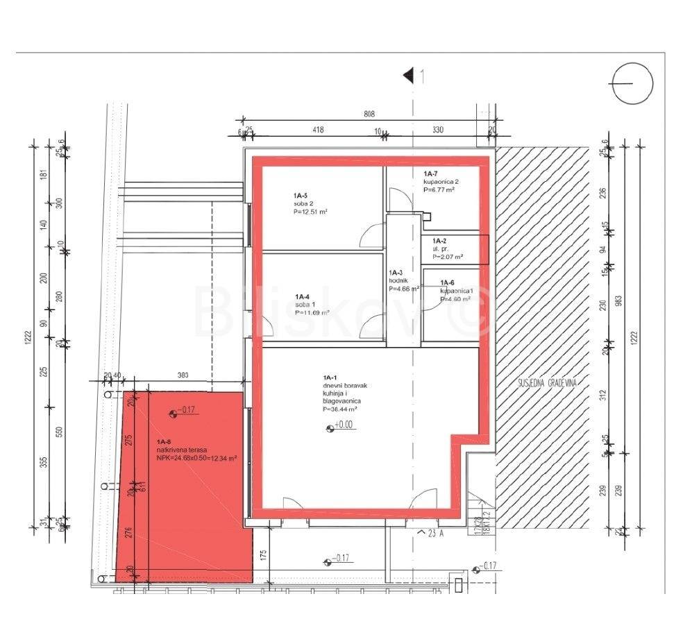 Dvosoban stan stambene površine 80,74 m2 + terasa 24,68 m2 te vrt površine 33,10 m2.