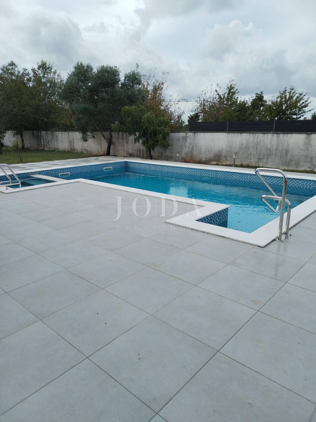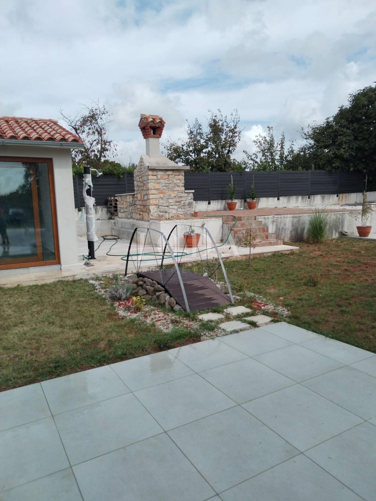 Na prostranoj okućnici nalazi se bazen sa sunčalištem, dodatni objekt, kamin, te dječje igralište, koje je također novo i neraspakirano, kao i vrtna garnitura, ležaljke i dvije nadstrešnice.