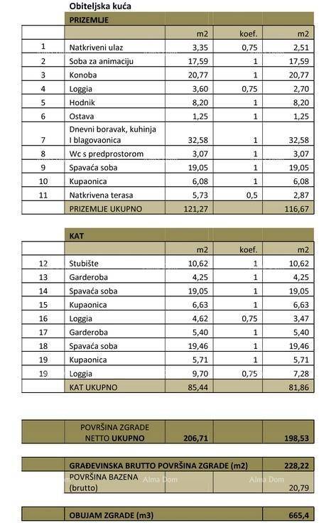 Novoizgrađena, moderna kuća, površine 206.71 (neto 198.53 m2) izgrađena je na parceli od 419 m2.