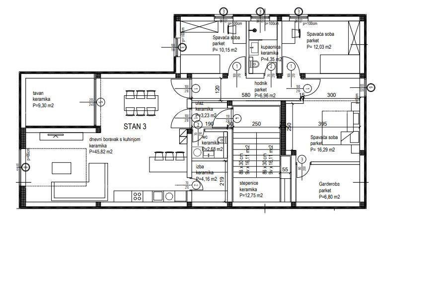 Trosoban stan S3 se nalazi na zadnjem katu zgrade od ukupno 3 stanova, jedan stan na svakom katu, ima stambenu površinu od 112.3 m2.