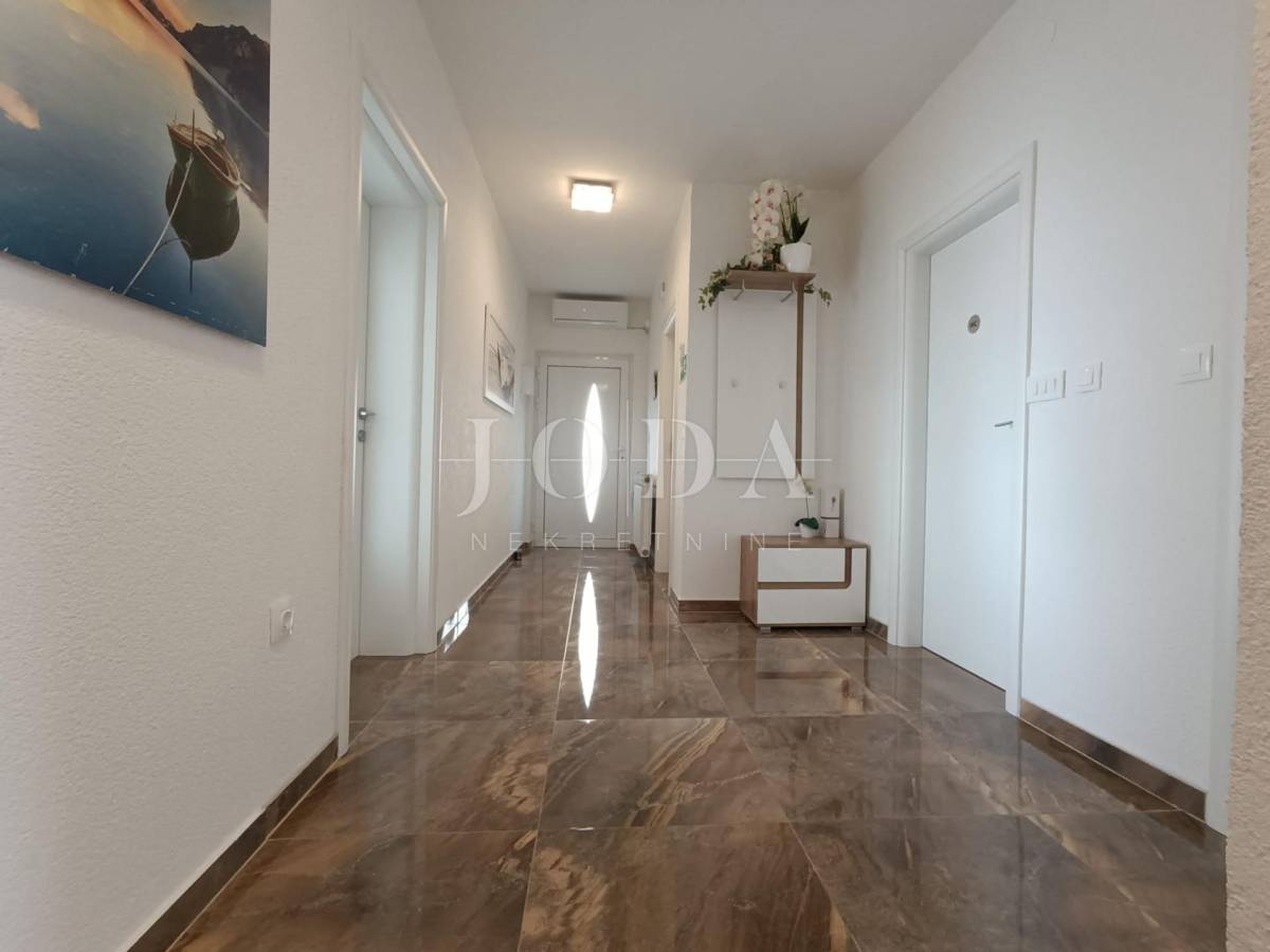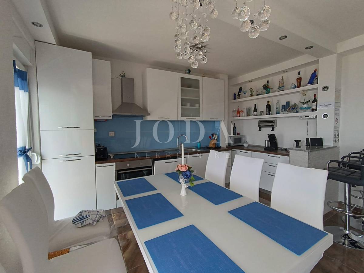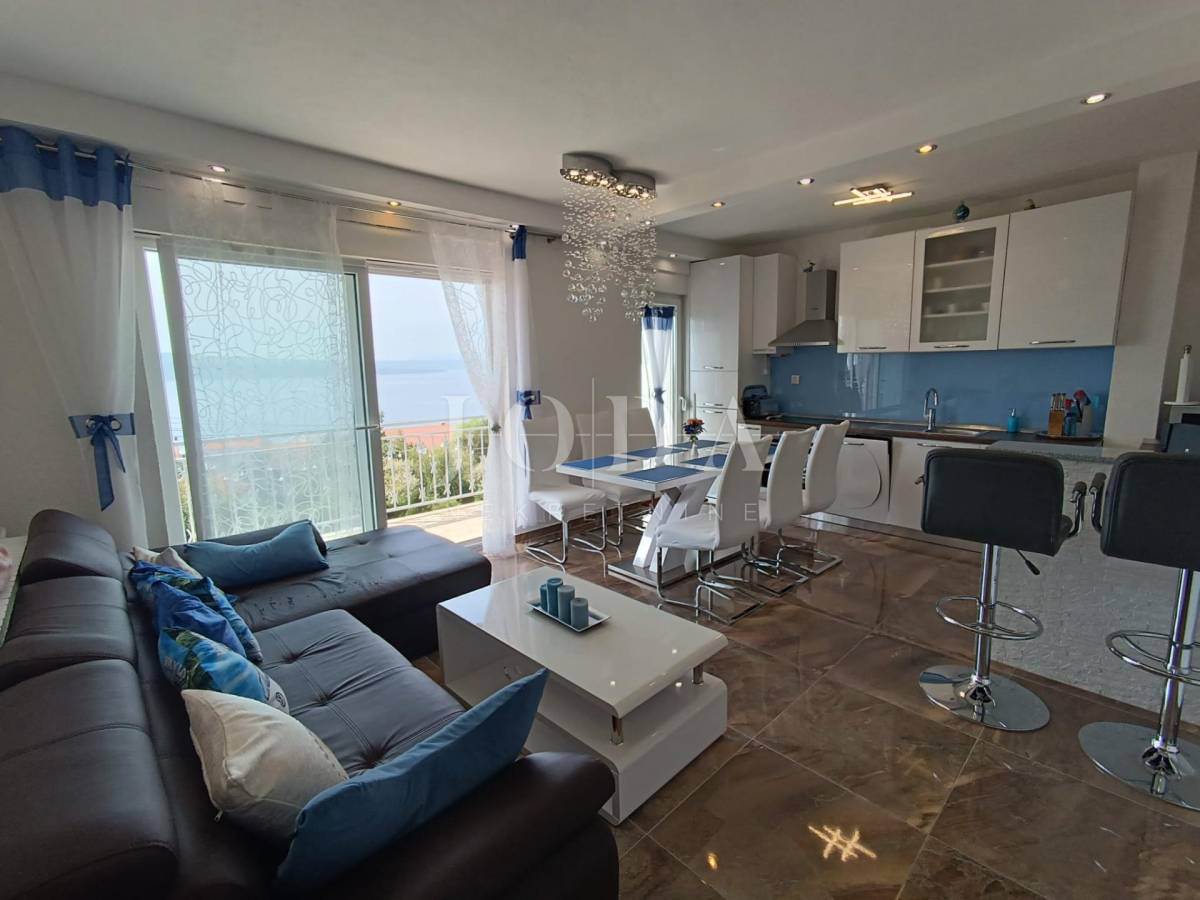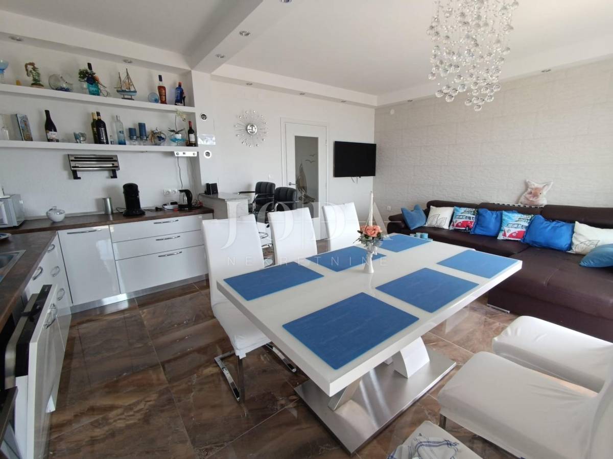 Stan je veličine 82m2 (bez lođe i spremišta) a sastoji od 3 prostrane spavaće sobe (jedna ima izlaz na lođu s pogledom na more), veće i manje kupaonice, kuhinje s blagovaonicom povezane s dnevnim boravkom s kojeg se izlazi na prostranu lođu sa prekrasnim pogledom na more. Stan je opremljen centralnim grijanjem na struju, klima uređajem te električnim podizačima roleta. Stan je izuzetno komforan te se koristi u turističke i osobne svrhe. Stanu dodatno pripada i parkirno mjesto i spremište.
