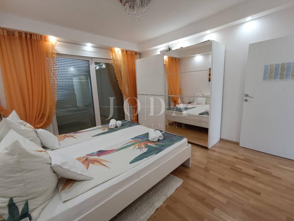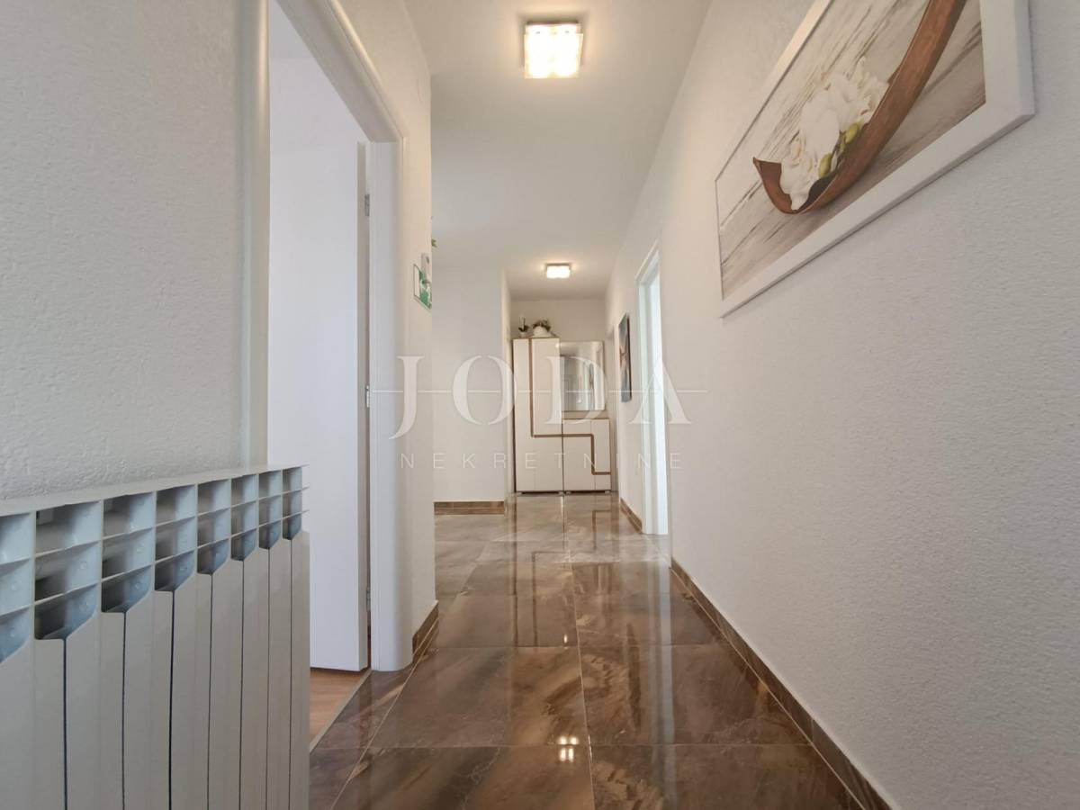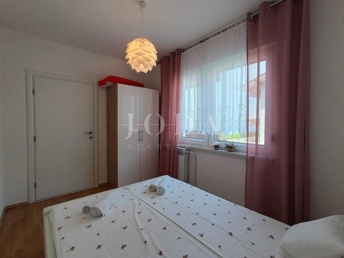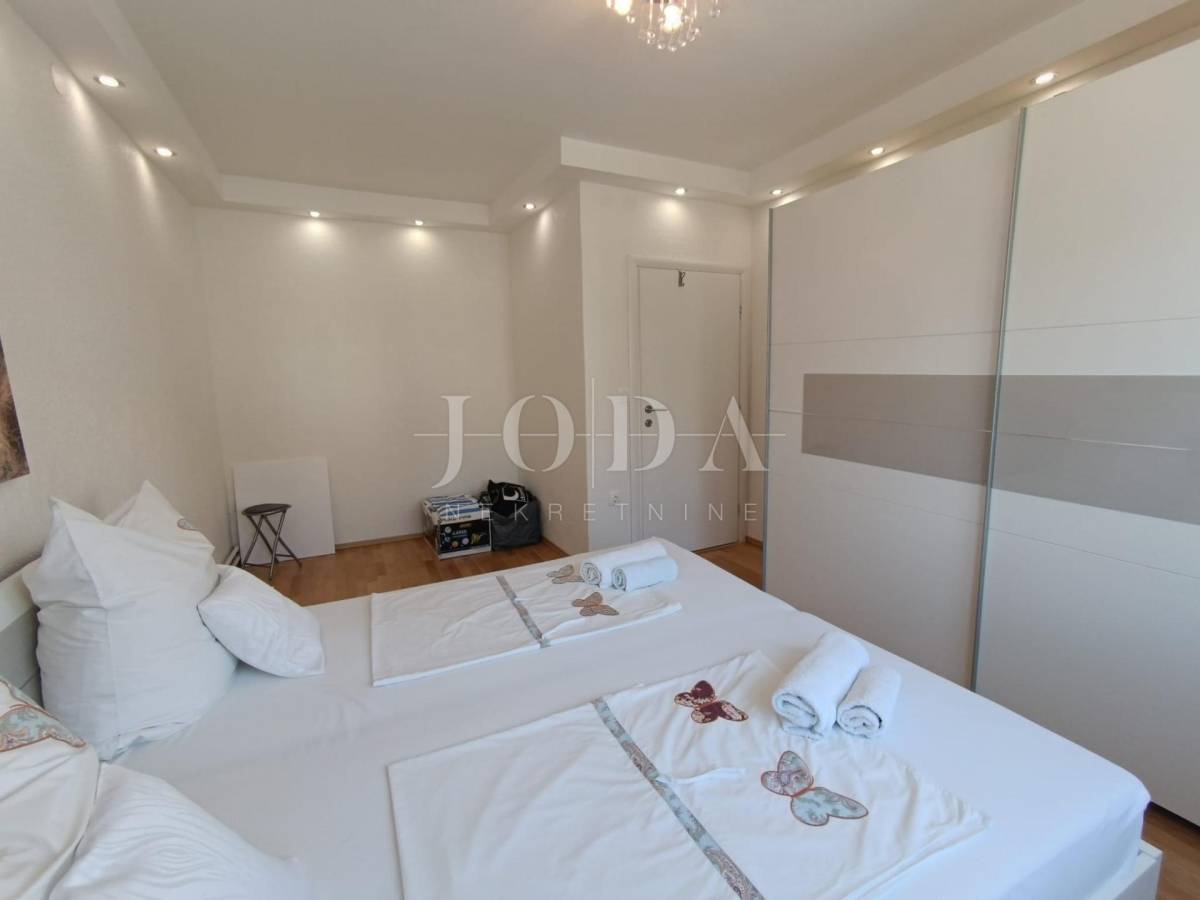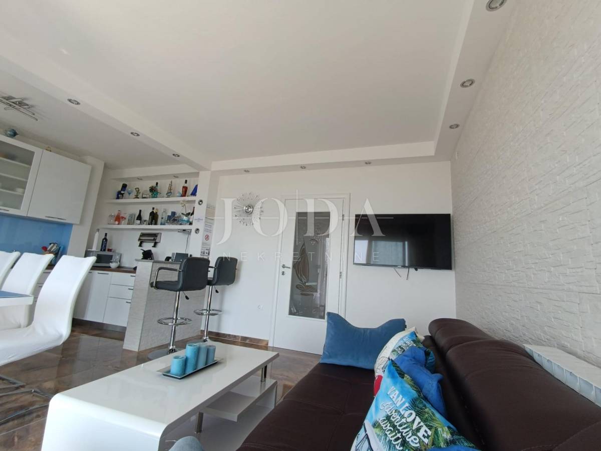 Stan je veličine 82m2 (bez lođe i spremišta) a sastoji od 3 prostrane spavaće sobe (jedna ima izlaz na lođu s pogledom na more), veće i manje kupaonice, kuhinje s blagovaonicom povezane s dnevnim boravkom s kojeg se izlazi na prostranu lođu sa prekrasnim pogledom na more. Stan je opremljen centralnim grijanjem na struju, klima uređajem te električnim podizačima roleta. Stan je izuzetno komforan te se koristi u turističke i osobne svrhe. Stanu dodatno pripada i parkirno mjesto i spremište.