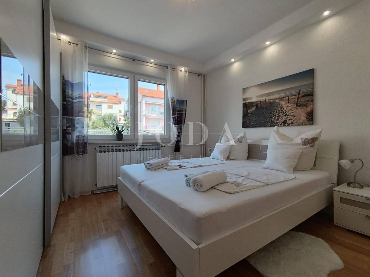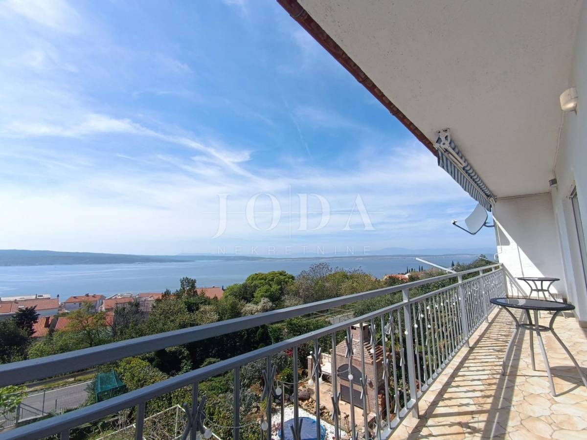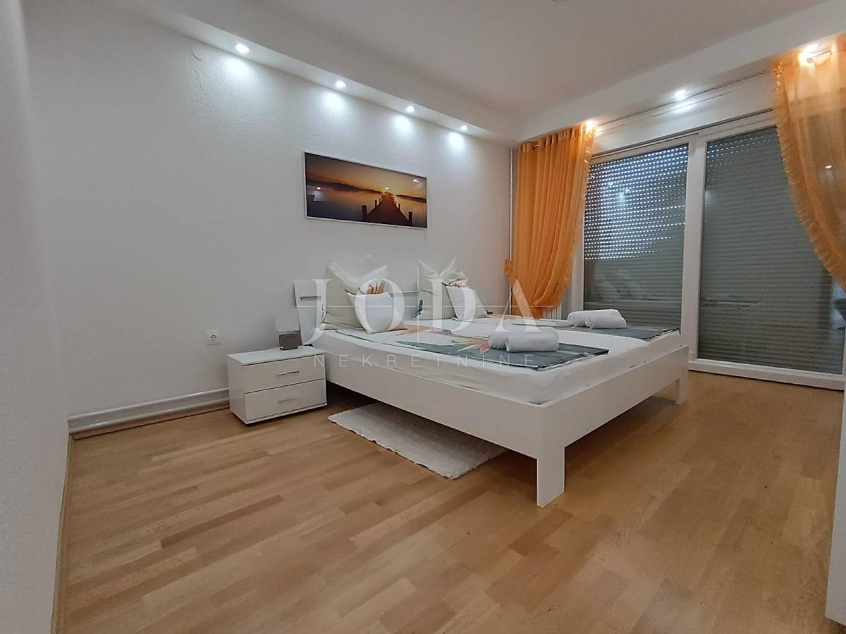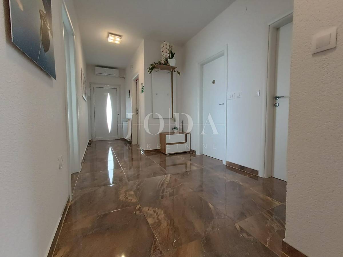 Stan je veličine 82m2 (bez lođe i spremišta) a sastoji od 3 prostrane spavaće sobe (jedna ima izlaz na lođu s pogledom na more), veće i manje kupaonice, kuhinje s blagovaonicom povezane s dnevnim boravkom s kojeg se izlazi na prostranu lođu sa prekrasnim pogledom na more. Stan je opremljen centralnim grijanjem na struju, klima uređajem te električnim podizačima roleta. Stan je izuzetno komforan te se koristi u turističke i osobne svrhe. Stanu dodatno pripada i parkirno mjesto i spremište.