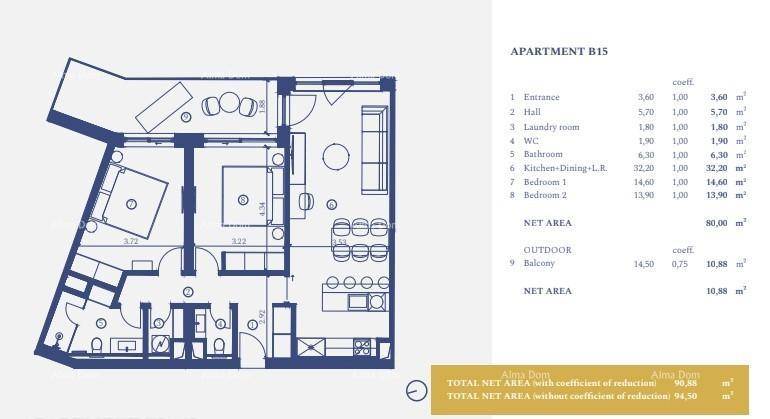 Apartman B-15 (94,5 m2) nalazi se u prizemlju: