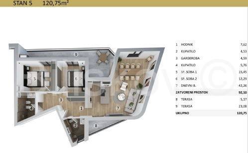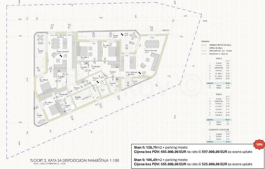 Osim ovoga apartmana, u ponudi imamo još pet apartmana površine od 120,75 do 181 m2. Uovoj fazi izgradnje moguće je spajati apartmane, mijenjati unutarnji raspored prostorija, biratimaterijale uređenja itd.Planirani završetak gradnje je srpanj 2027. godine.
