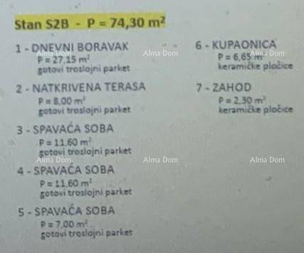 Ukupna površina stana iznosi 74,30 m².