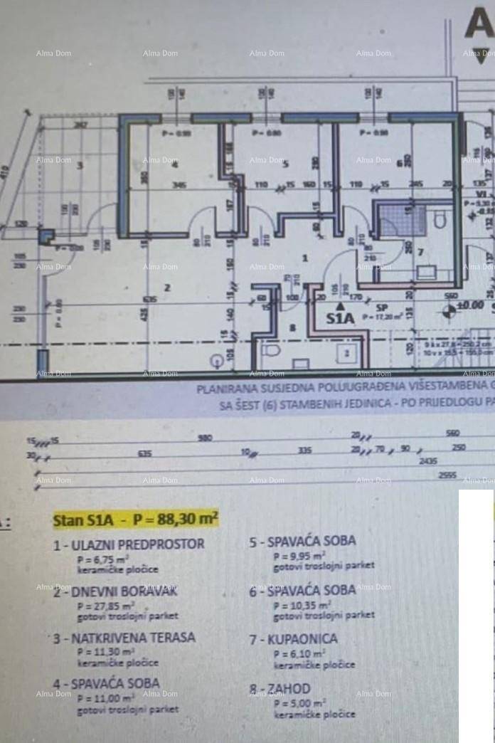 Stan se nalazi u prizemlju zgrade suvremenog dizajna. Kompleks se sastoji od ukupno 12 stanova te uključuje podzemnu garažu s vlastitim parkirnim mjestima. Dodatnu vrijednost ovoj nekretnini daje grijani bazen dimenzija 6 x 12 m smješten ispred zgrade.