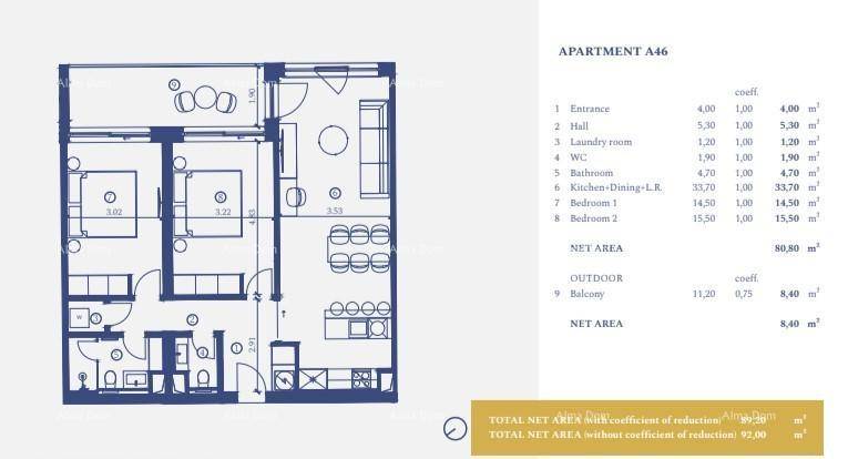Apartman A-46 (92 m2) nalazi se na 3.katu: