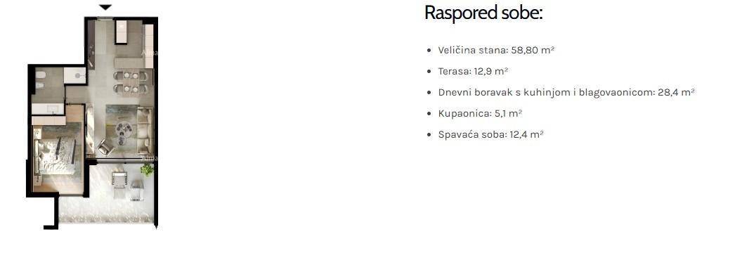 Stan S33, ukupne površine 58,80 m², nalazi se na 1.katu zgrade i sastoji se od: