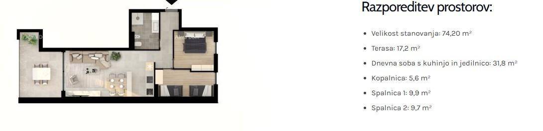 Stan S76, ukupne površine 74,20 m², nalazi se u prizemlju zgrade i sastoji se od: