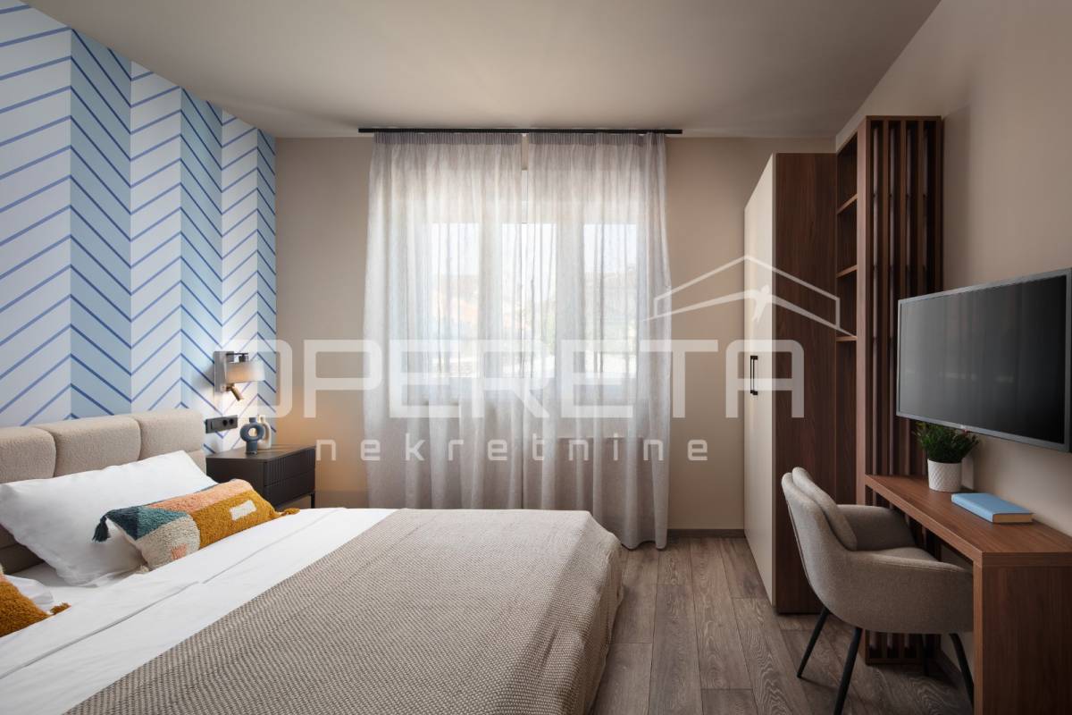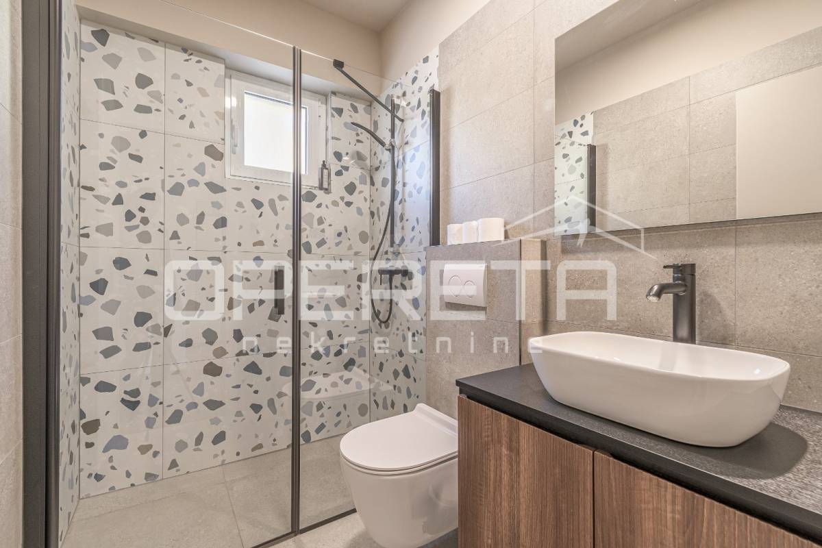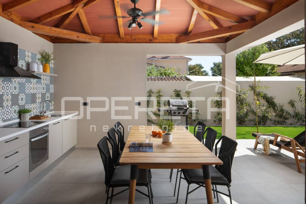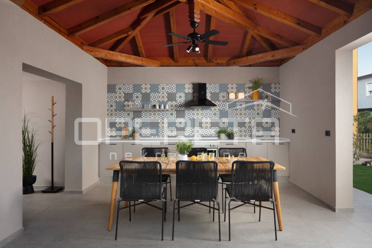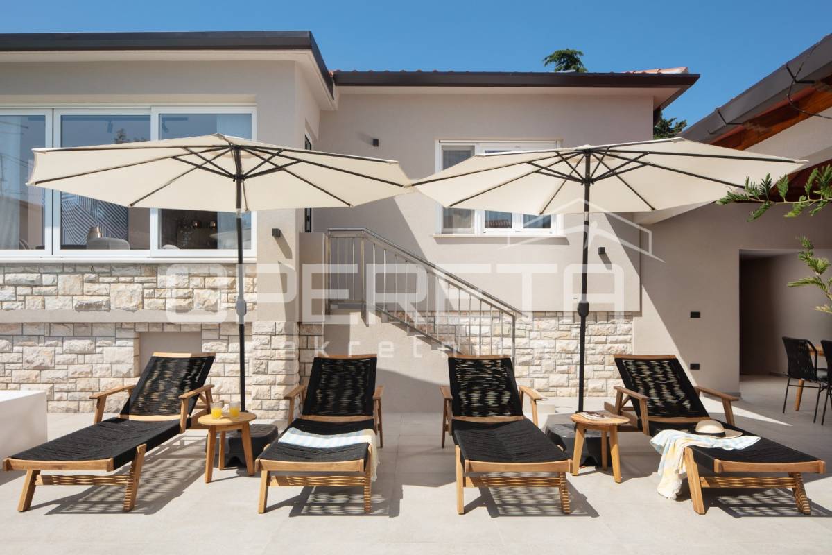 Na uređenoj i ograđenoj okućnici smješten je privatni bazen s rasvjetom i funkcijom hidromasaže, prostor za sunčanje, roštilj, hortikulturno uređen vrt te dva parkirna mjesta unutar dvorišta.