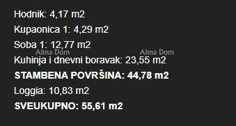 Stan ima ukupnu površinu 55,61 m² i oznaku 3-10. Sastoji se od hodnika, kuhinje i dnevnog boravka, kupaonice, spavaće sobe te lođe 10.83 m².