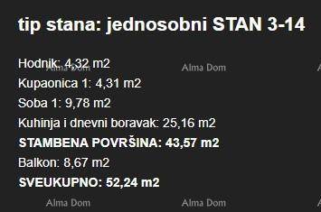 Stan ima ukupnu površinu 52,24 m² i oznaku 3-14. Sastoji se od hodnika, kuhinje i dnevnog boravka, kupaonice, spavaće sobe te balkona 8.67 m².