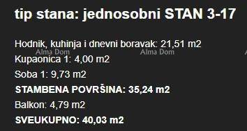 Stan ima ukupnu površinu 40,03 m² i oznaku 3-17. Sastoji se od hodnika, kuhinje i dnevnog boravka, kupaonice, spavaće sobe te balkona 4.79 m².