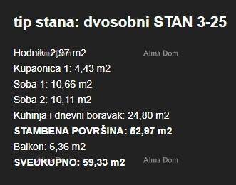 Stan ima ukupnu površinu 59,33 m² i oznaku 3-25. Sastoji se od hodnika, kuhinje i dnevnog boravka, kupaonice, 2 spavaće sobe te balkona 6,36 m².