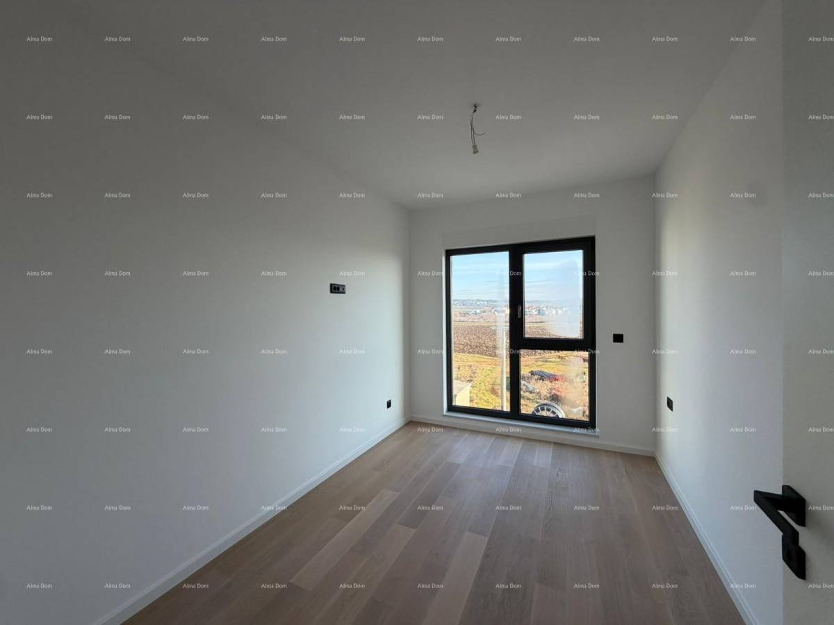Zgrada je građena armirano-betonskom konstrukcijom, s termoizolacijskom fasadom (ETICS 10 cm). Ugrađena je visokokvalitetna PVC stolarija s podizno-kliznim stijenama, električne rolete u sobama, multisplit klimatizacija u svim prostorijama, prvoklasna keramika i parket. Stan ima vlastito brojilo struje i vode, video parlafon te priključke za internet i TV.