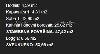 Stan ima ukupnu površinu 53,98 m² i oznaku 2-28. Sastoji se od ulaznog prostora, kuhinje i dnevnog boravka, kupaonice, spavaće sobe te lođe površine 9.98 m².
