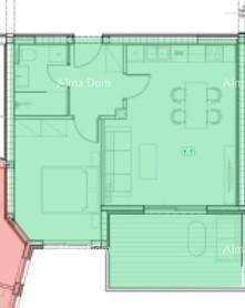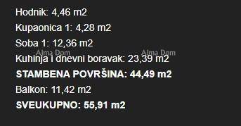 Stan ima ukupnu površinu 55,91 m² i oznaku 3-07. Sastoji se od hodnika, kuhinje i dnevnog boravka, kupaonice, spavaće sobe te balkona površine 11.42 m².