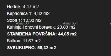 Stan ima ukupnu površinu 56,32 m² i oznaku 3-08. Sastoji se od hodnika, kuhinje i dnevnog boravka, kupaonice, spavaće sobe te balkona površine 11.67 m².