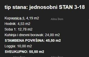 Stan ima ukupnu površinu 55,5 m² i oznaku 3-18. Sastoji se od hodnika, kuhinje i dnevnog boravka, kupaonice, spavaće sobe te balkona 10 m².