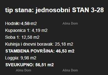Stan ima ukupnu površinu 56,51 m² i oznaku 3-28. Sastoji se od hodnika, kuhinje i dnevnog boravka, kupaonice, spavaće sobe te balkona 9,98 m².