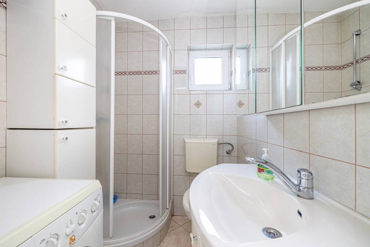 U prizemlju se nalazi svijetao i prozračan dnevni boravak, opremljen udobnim kožnim namještajem koji poziva na opuštanje. Moderna kuhinja s blagovaonicom savršena je za zajedničke obroke, dok prostrani balkon nudi mjesto za jutarnju kavu uz zvuk valova. Na ovoj etaži nalazi se i udobna spavaća soba, kao i elegantna kupaonica s perilicom rublja i tušem.