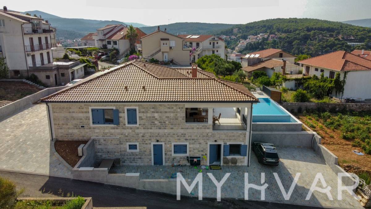 Na prvom katu pronaći ćete prostrani dnevni boravak, blagovaonicu i modernu kuhinju otvorenog koncepta, te hodnik i tri spavaće sobe od kojih svaka ima svoju kupaonicu. Izađite na prostranu terasu, zajedno s pjenušavim bazenom, prostorom za roštilj i prekrasnim panoramskim pogledom na more i okolnu prirodu.