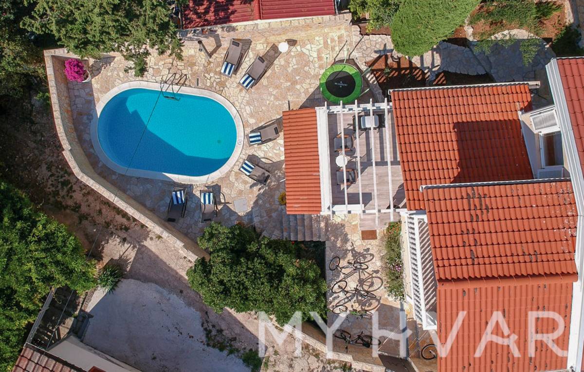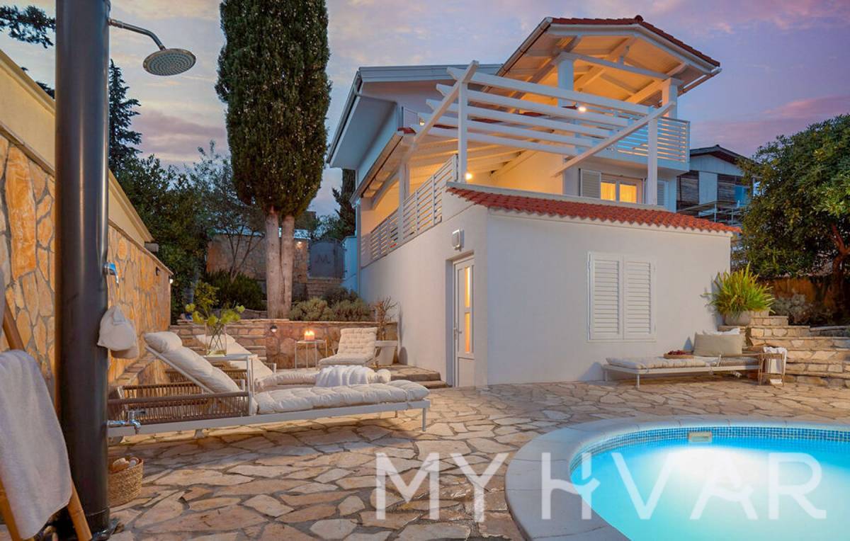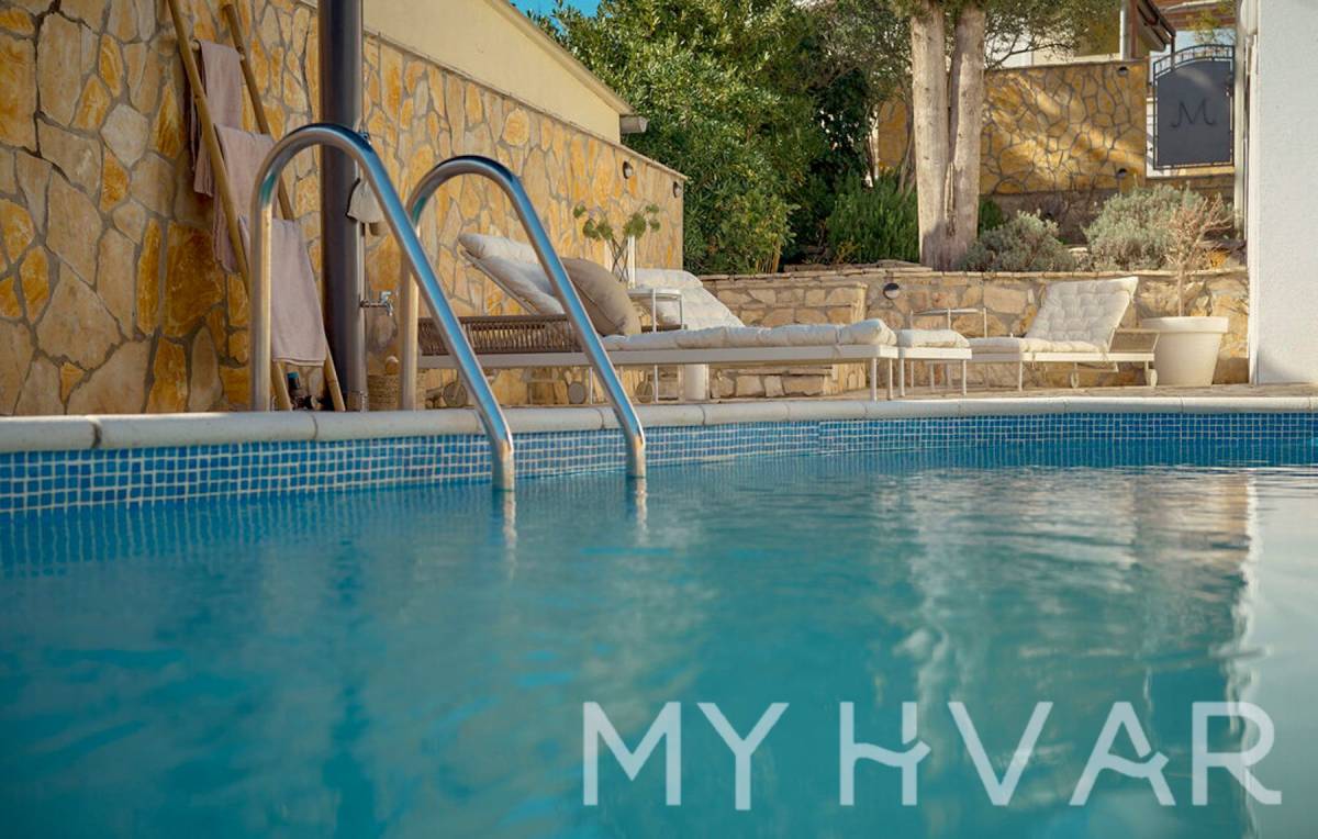 Vanjski sadržaji uključuju osvježavajući bazen od 24 m², privatno dvorište i dva parkirna mjesta, što osigurava opuštanje i udobnost na dohvat ruke.