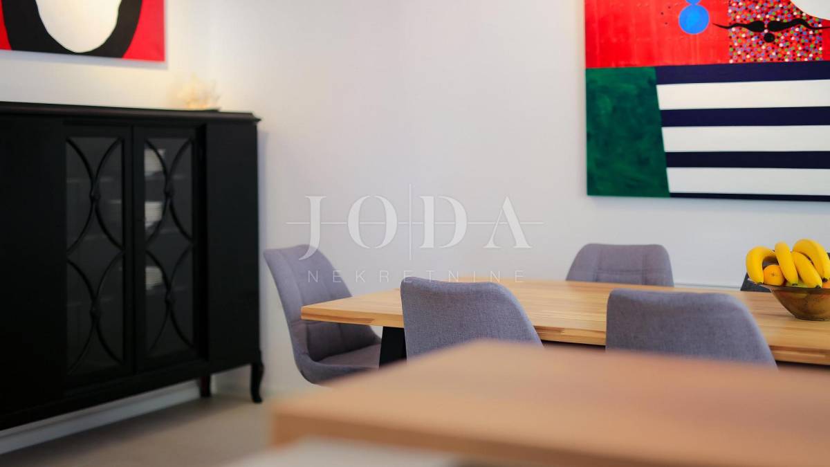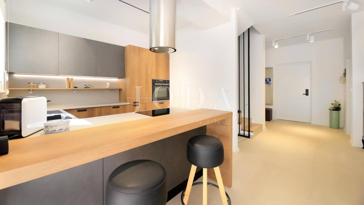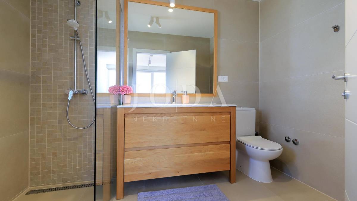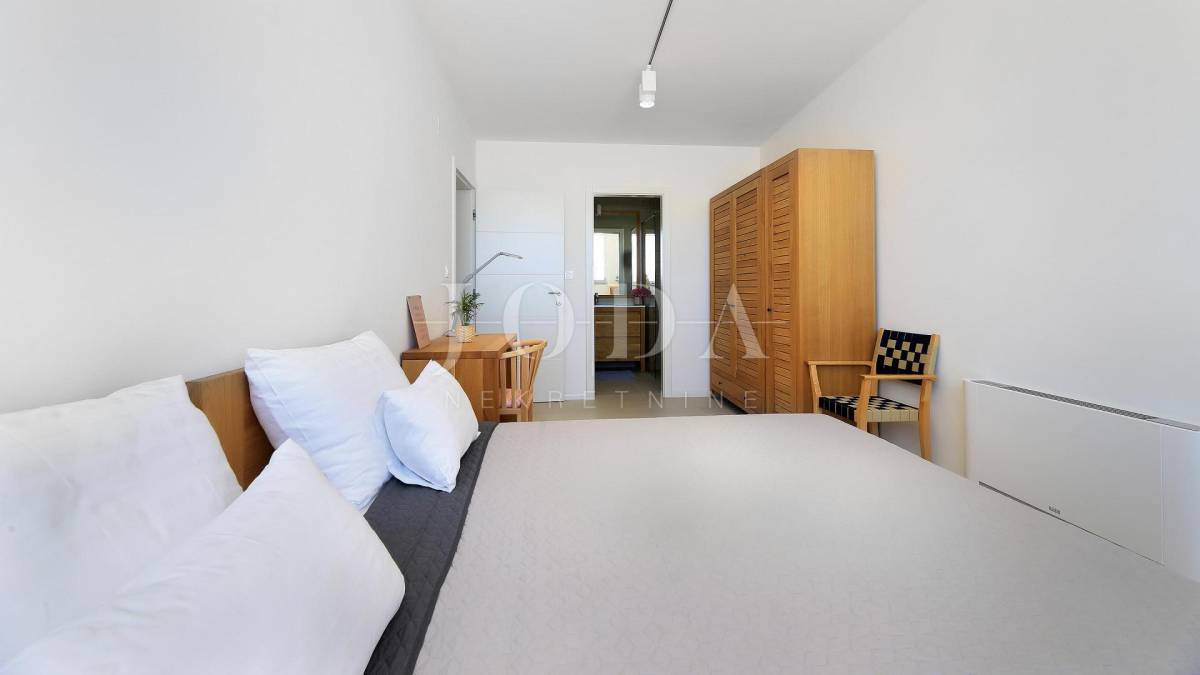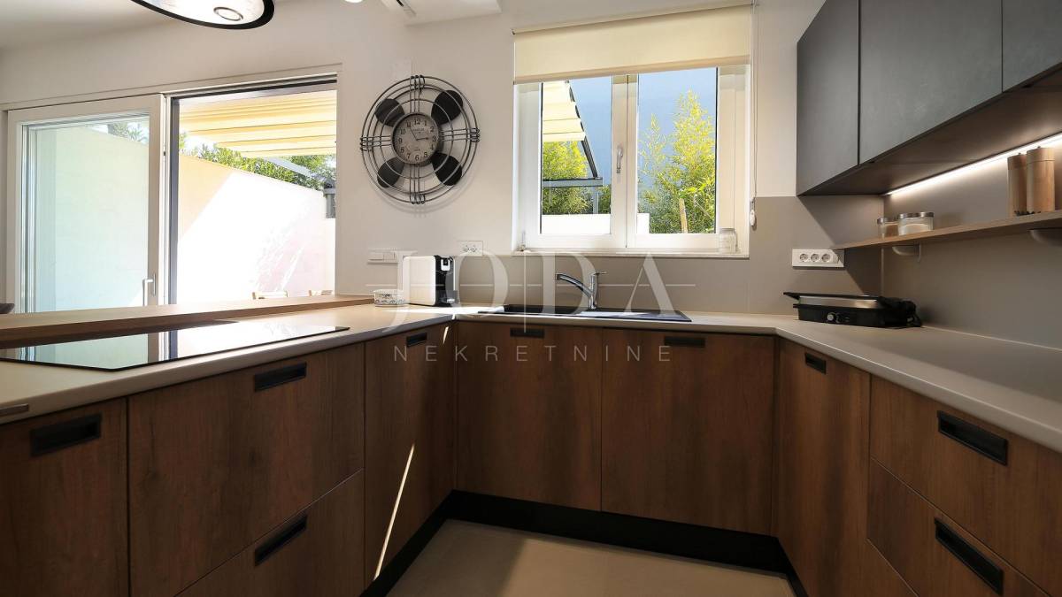 Villa je podijeljena na dva kata s poluetažama. Ukupne površine je 212 m2 ( brutto 251 m2 ) i izgrađena je na parceli od 619 m2. U prizemlju se nalazi hodnik sa spremištem, vešerajem i toaletom. Kroz hodnik se dolazi u open space kuhinju i blagovaonicu s izlazom na terasu s sklopivom pergolom te dnevni boravak koji je povezan s još jednom terasom. Unutarnjim stepenicama se dolazi na kat gdje se nalaze sveukupno četiri spavaće sobe s vlastitim kupaonicama i francuskim balkonima s kojih se pruža prekrasan pogled na more. Sa krovne terase se pruža otvoren pogled na more i Malinsku. Na uređenoj okućnici prepunoj mediteranskih biljaka se nalazi veliki bazen površine 34 m2 i sunčalište. U izgradnji i opremanju ville koristili su se najkvalitetniji materijali kao što su aluminijska stolarija s griljama, troslojni prozori s UV zaštitom, komarnici na svim prozorima, digitalna ulazna vrata, vrtna rasvjeta i sustav za navodnjavanje, sustav grijanja i hlađenja pomoću dizalice topline LG te video nadzor i alarmni sustav. Villa ima tri uređena parkirna mjesta natkrivena sjenilom. Nalazi se na izvrsnoj lokaciji punoj privatnosti, ali blizu svih potrebnih sadržaja.