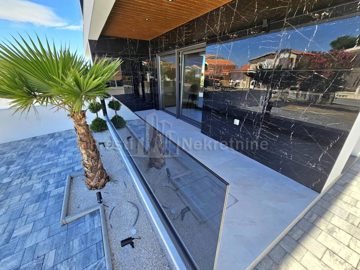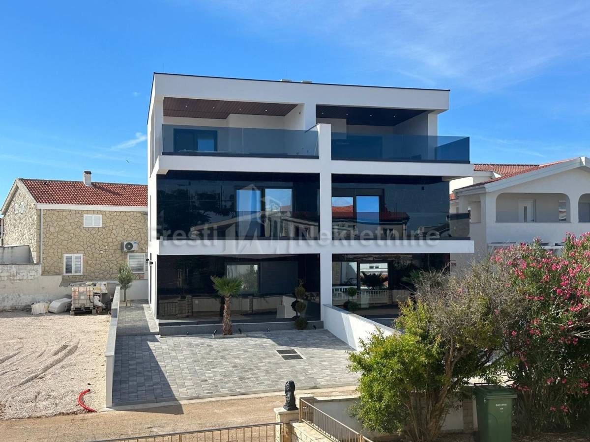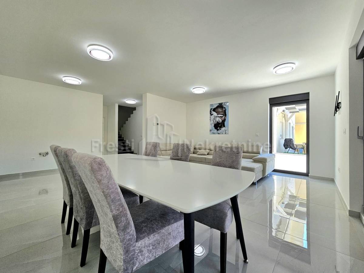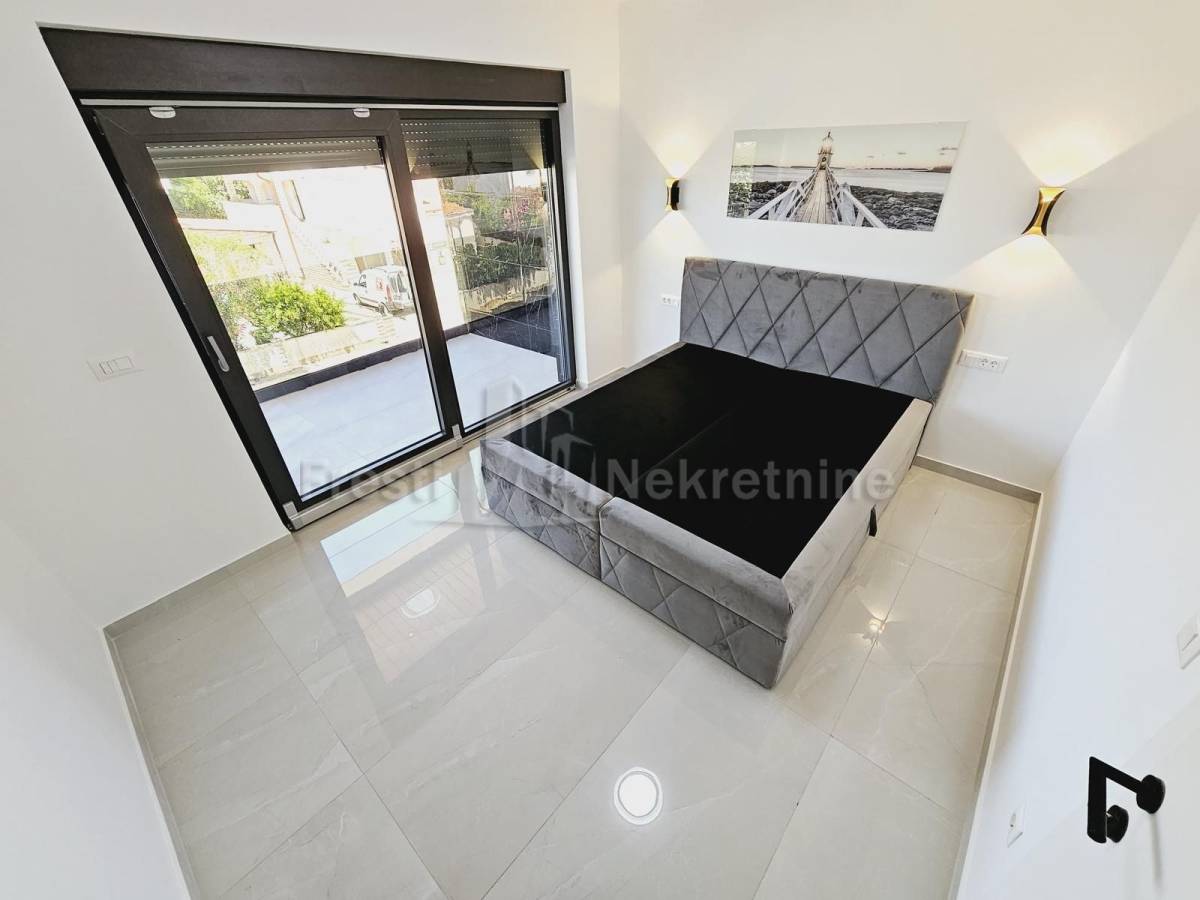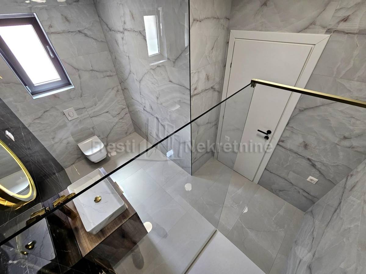 Ova elegantna i prostrana kuća prostire se na tri etaže: U prizemlju se nalazi prostrani dnevni boravak s otvorenom kuhinjom i blagovaonicom, kupaonica, ostava i natkrivena terasa. Na prvom katu se nalaze dvije spavaće sobe od kojih jedna ima svoju garderobu, kupaonicu, te izlaz na natkrivenu terasu. Na drugom katu se nalazi glavna spavaća soba sa vlastitom kupaonicom i prostranom terasom od 33,42 m2. Na terasi se nalazi ljetna kuhinja s roštiljem, a postoji mogućnost ugradnje jacuzzija. Kuća je izgrađena visokokvalitetnim materijalima, stolarija ima električne podizače roleta s Wi-Fi upravljanjem. Podno grijanje postavljeno je na svakoj etaži, a sve spavaće sobe i dnevni boravak bit će klimatizirani. Pripadaju joj dva parkirna mjesta. MATERIJALI ZA UGRADNJU PVC vanjska stolarija s troslojnim staklom, električnim roletama i komarnicima Ulazna vrata su protuprovalna, protupožarna Podne obloge su visokokvalitetne keramičke pločice u cijeloj kući Visokokvalitetne saniterije INSTALACIJE I OPREMA Podno grijanje koje je spojeno Wi-fi Hlađenje preko klima uređaja koji se nalaze u svim spavaćim sobama kao i u dnevnom boravku Video portafon Zasebni priključak, vode, struje i kanalizacije LOKACIJA Nalazi se na samo 90m od mora odnosno nekoliko minuta hoda. Na mirnoj lokaciji u neposrednoj blizini se nalaze svi sadržaji potrebni za svakodnevni život i ugodan odmor poput dućana, restorana i kafića. Svaki kat ima natkrivenu terasu sa koje se pruža predivan pogled na more, dok terasa na drugom katu ima izvedene instalacije struje i vode, rostilj, kuhinja, jacuzzi. Dvojna kuća ima vlastite priključke. Planirano vrijeme useljenja 6/2024g. VLASNIŠTVO uredno, 1/1 bez tereta ______________________________________________________