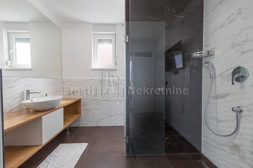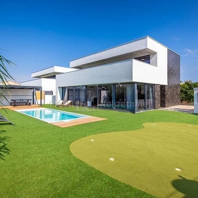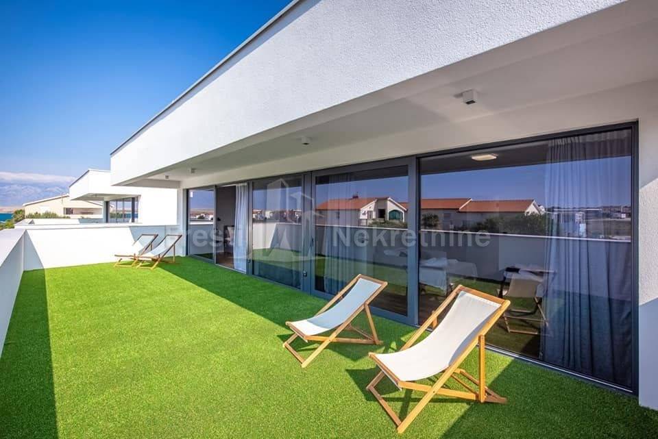 Sobe imaju izlazak na veliku terasu površine 45 m2, sa otvorenim pogledom na more.Vlastiti bazen 25 m2, dimenzija 8 x 3,20 i dubine 1,5 metara.Uređenje eksterijera je planirano u kombinaciji vrhunske umjetne trave s mini golf temom i sa prirodnim zelenilom i pravim biljkama.