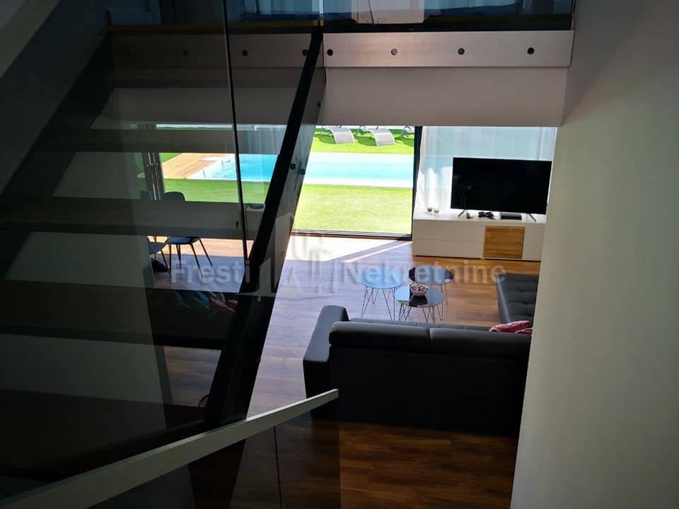 kuhinja i dnevni boravak površine ~45 m2, otvorenog tipa s velikim staklenim stijenama pružajući otvoren pogled, spoj interijera i eksterijera, i s direktnim izlazom na bazen,