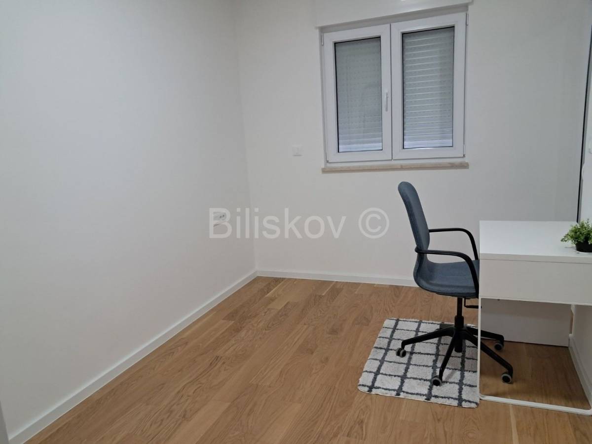 Sastoji se od kuhinje s trpezarijom i dnevnog boravka, dvije spavaće sobe, kupatila i lođe. Jedna spavaća soba trenutno je opremljena kao radna ali u slučaju potrebe dodatnog kreveta, vlasnik će ga kupiti.