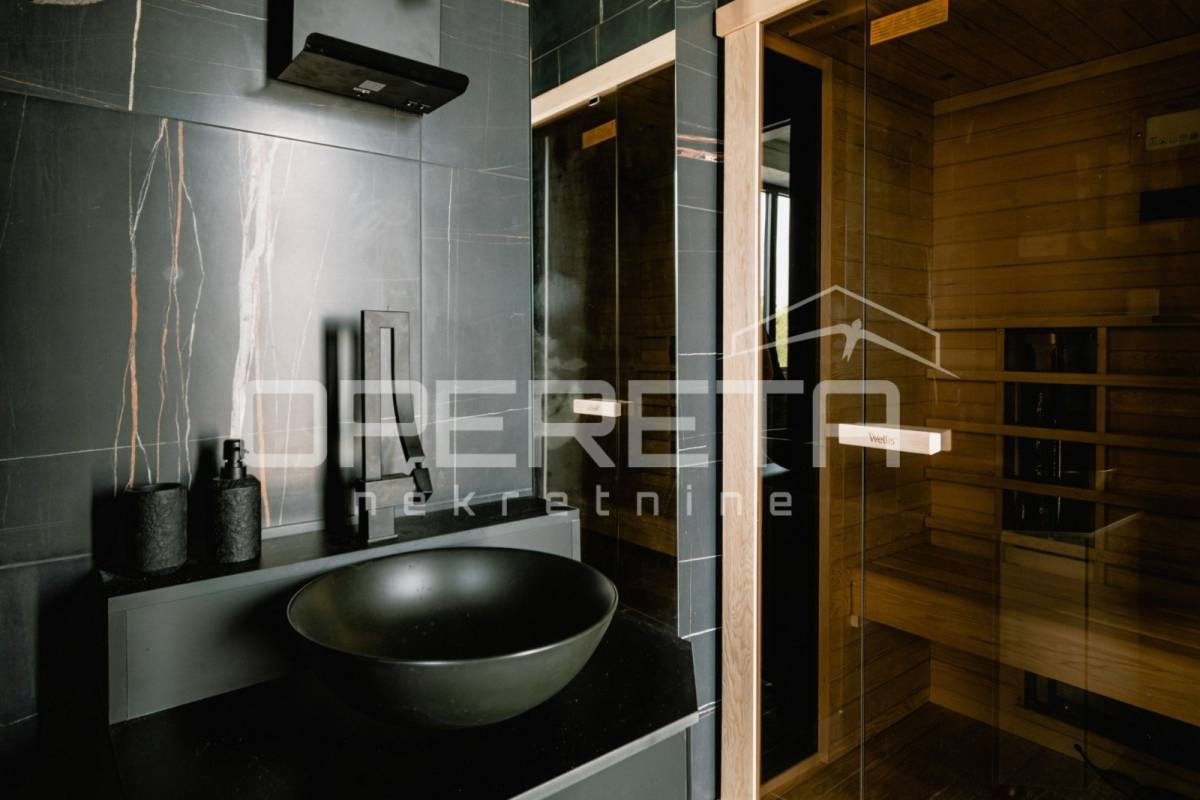 Elegantno stubište vodi na kat gdje se nalaze tri spavaće sobe, zajednička kupaonica s integriranom saunom te master spavaća soba s vlastitom kupaonicom i izlazom na balkon. Svaka soba ima pristup vlastitom balkonu, zaštićenom pomičnim brisolejima, dok drvene grede na bočnim okvirima balkona stvaraju dojam luksuza i topline.