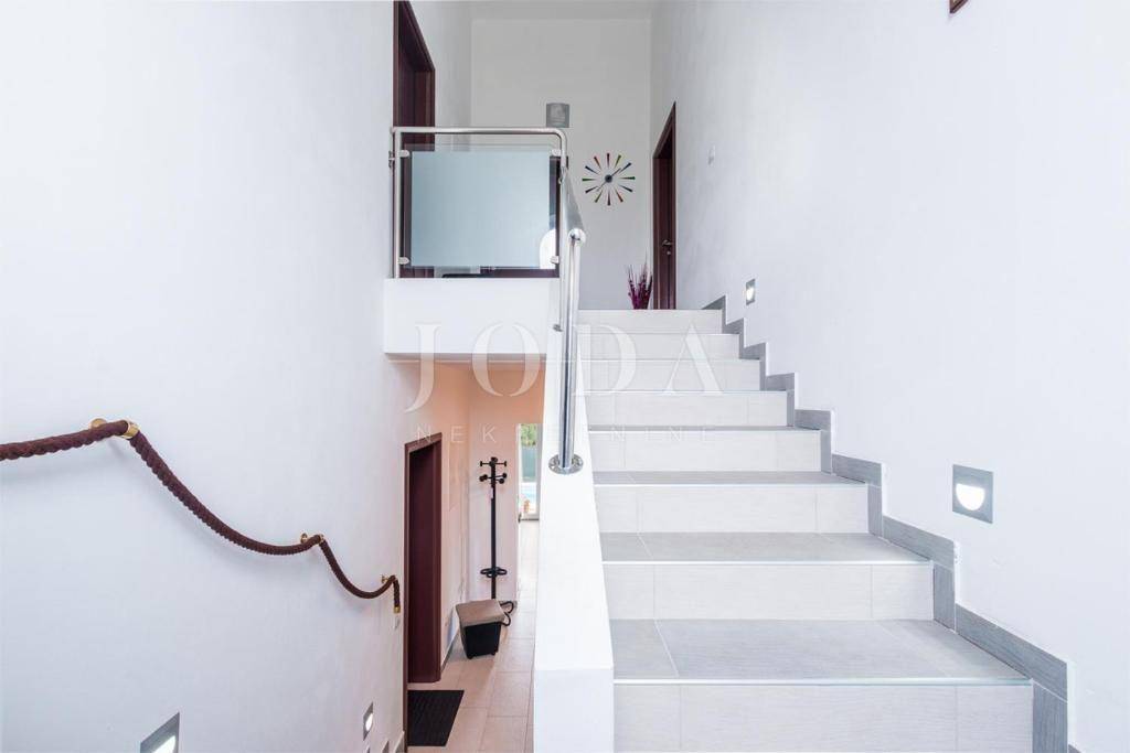Stepenicama dolazimo na kat, gdje su smještene još tri spavaće sobe sa kupaonama. Dvije sobe imaju izlaz na zajednički veliki balkon sa pogledom na bazen i dvorište, dok jedna ima vlastiti posrebni balkon.