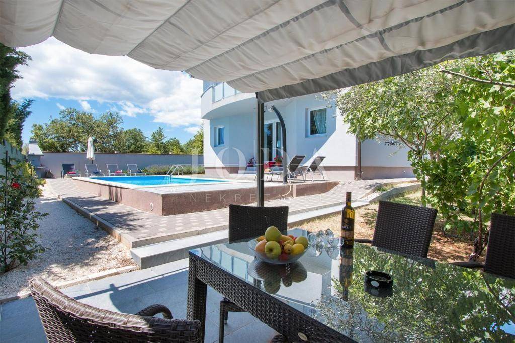 Na ograđenoj okućnici nalazi se bazen sa plažom, roštilj, ljetna terasa za uživanje u toplim ljetnim mjesecima, parkirna mjesta, te dječje igralište.