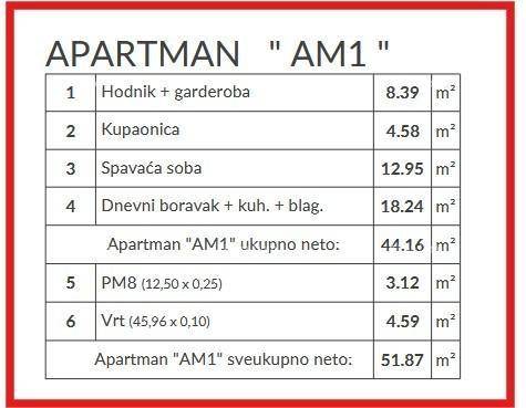 Stan AM1-unutrašnje površine 44.16 m2 nalazi se u prizemlju zgrade i sastoji od: hodika+garderoba, kupaonice, spavaće sobe, dnevnog boravka s kuhinjom i blagavaonom i vrta od 45.9 m2 (neto 4.59m2)
